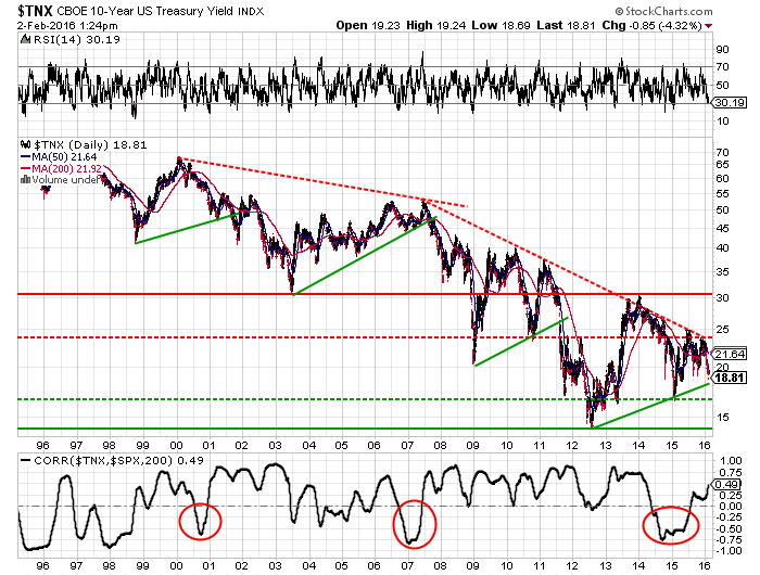 Submitted by Wespac Advisors, LLC on February 2nd, 2016- 10-Year Treasury rates started a downtrend in 2000, accelerating in the 2008 Crisis; this downtrend was challenged in November-December 2015 as the Federal Reserve ended the ZIRP program, raising the Federal Funds Rate to a target of 0.25-0.50%.