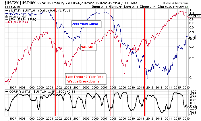 This is a long-term chart comparing the 2-year versus 10-year Treasury Rate yield curve to the S&P 500. The last three wedge breakdowns in 10-year rates occurred around the start of a flattening of the 2v10 yield curve. There were clearly challenges in the equity markets around these events in 2001, 2007 and 2011.