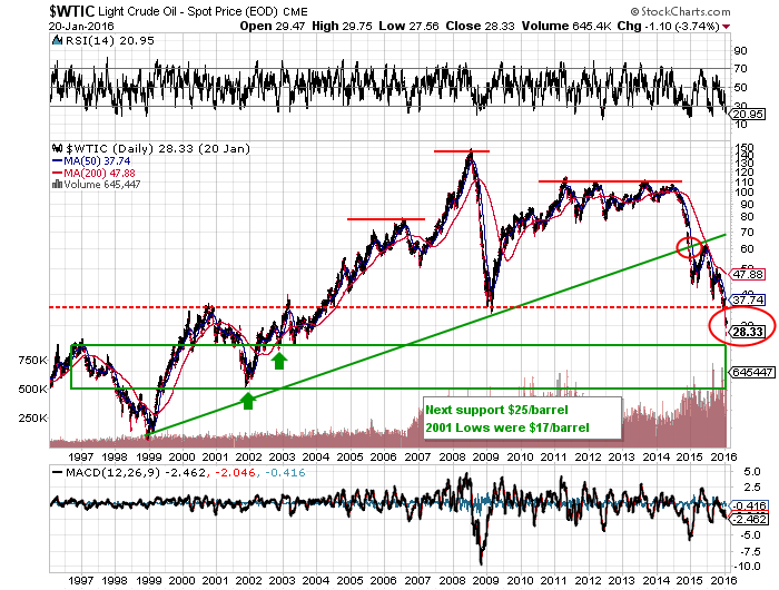 US equity markets have been largely running in lockstep with crude oil prices; crude oil is now trading below the 2009 lows and appears headed for support in the 2002-2003 lows in the $17-25/barrel range.