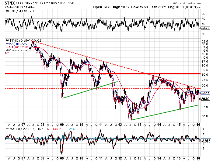 - 10-Year Treasury rates have a similar pattern and have just failed at their downtrend line dating back to 2006; rates have already fallen to 2.0% and likely to fall at a minimum to 1.8% if prior patterns continue.
